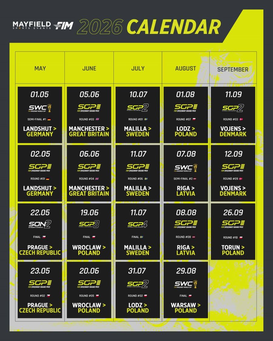 FIM Speedway Grand Prix opublikowało kalendarz przyszłorocznej rywalizacji o najlepszego żużlowca świata.