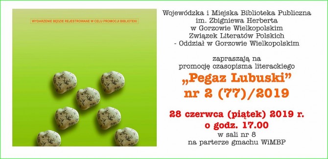 Wojewódzka i Miejska Biblioteka Publiczna im. Zbigniewa Herberta oraz Związek Literatów Polskich Oddział Gorzowie zapraszają na promocję czasopisma literackiego „Pegaz Lubuski” nr 2 (77)/2019. Spotkanie promocyjne odbędzie się 28 czerwca o godz. 17.00 w sali nr 8 gmachu WiMBP.