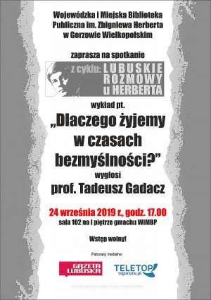 Wojewódzka i Miejska Biblioteka Publiczna im. Zbigniewa Herberta serdecznie zaprasza na kolejne spotkanie z cyklu "Lubuskie rozmowy u Herberta". Tym razem będziemy gościć znanego i cenionego filozofa prof. Tadeusza Gadacza, który 24 września (wtorek) o godz. 17.00 spróbuje odpowiedzieć na pytanie "Dlaczego żyjemy w czasach bezmyślności?".