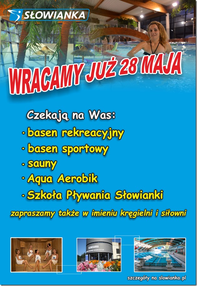 Centrum Sportowo-Rehabilitacyjne Słowianka wznawia w piątek (28 maja) działalność w pełnym zakresie i zaprasza codziennie od godziny szóstej rano do godziny 21.45.