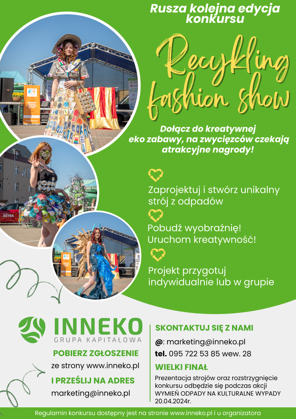 Organizatorem konkursu „Recykling Fashion Show” jest gorzowska spółka Inneko. Całość potrwa do 20 kwietnia, kiedy to poznamy zwycięzców. Każdy chętny musi jednak wcześniej, bo do 15 marca zgłosić swój akces udziału w konkursie poprzez wysłanie meilem na adres marketing@inneko.pl zgłoszenia znajdującego się na stronie organizatora. W konkursie mogą brać udział praktycznie wszyscy, którzy ukończyli 18 lat i mają pełną zdolność do czynności prawnych. Prace mogą być też zbiorowe, przygotowywane przez organizacje społeczne.