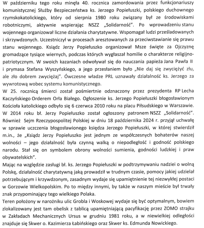 Gorzowscy radni jednogłośnie na ostatniej sesji Rady Miasta podjęli uchwałę o nadaniu skwerowi u zbiegu ulic Grobli i Woskowej imienia bł. ks. Jerzego Popiełuszki.