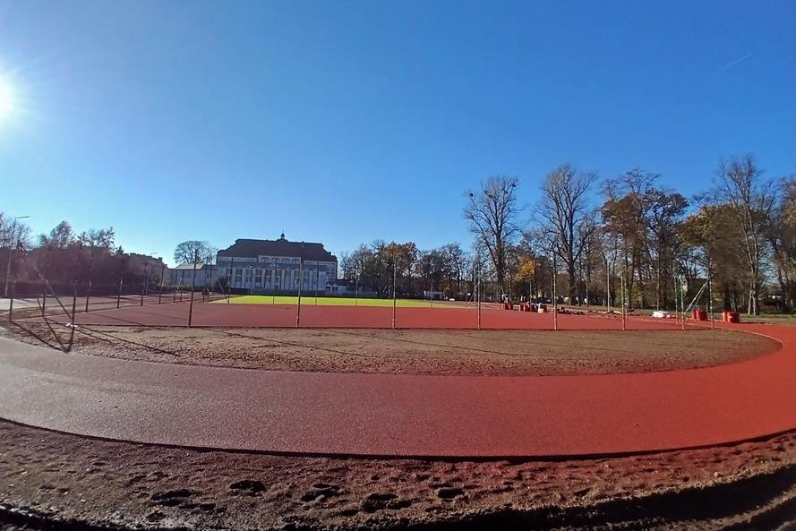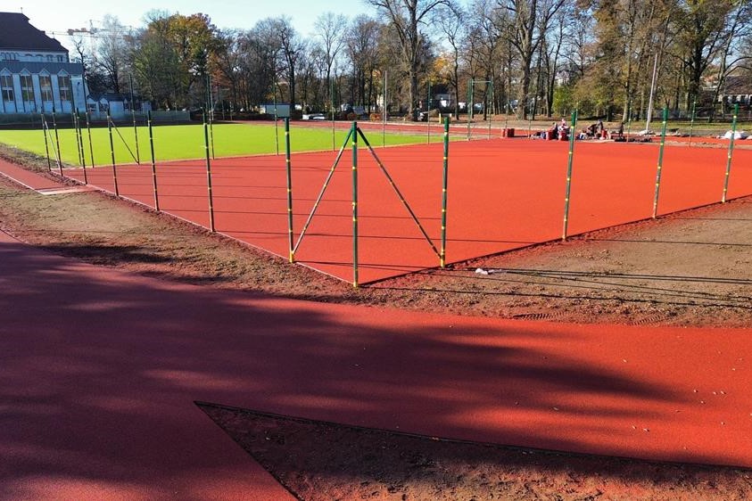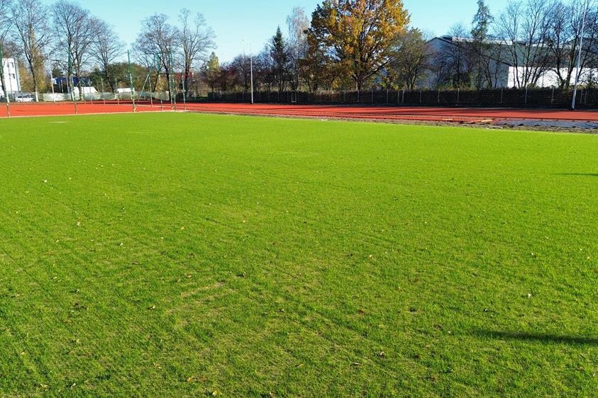 Wykonawca rozpoczął układanie ostatniej, natryskowej warstwy nawierzchni na boisku wielofunkcyjnym, bieżniach oraz skoczni w dal. Zakończono prace przy systemie nawadniania boiska trawiastego, na którym pojawiła się już piękna, zielona trawa. Gotowe jest również oświetlenie terenu, które umożliwi korzystanie z obiektu także po zmroku.