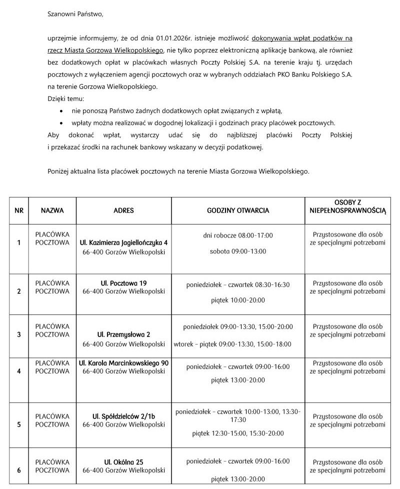 Można płacić również bez dodatkowych opłat w placówkach własnych Poczty Polskiej S.A. na terenie kraju tj. urzędach pocztowych z wyłączeniem agencji pocztowych oraz w wybranych oddziałach PKO Banku Polskiego S.A. na terenie Gorzowa Wielkopolskiego.