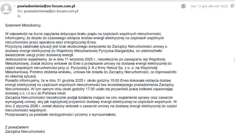 Co ciekawe, wniosek o przepisanie umowy na dostawę energii do części wspólnych przez dewelopera na powstałą właśnie Wspólnotę został złożony do Enei 11 września 2025, a mimo to umowa podobno nie dotarła do zarządcy nieruchomości. Czyli co, ktoś nie dostarczył jakiegoś papierka, ktoś coś zaniedbał, może nie złożył podpisu pod umową, bo wybrał się na narty i nagle w środku zimy lokatorzy 30 mieszkań musieli chodzić z latarkami po klatkach schodowych?