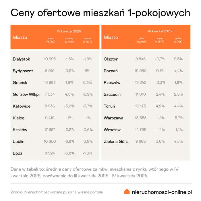 W IV kwartale 2025 r. średnia cena ofertowa za kawalerkę z rynku wtórnego spadła w ośmiu miastach wojewódzkich. W tym gronie znalazły się: Warszawa, Wrocław, Łódź, Lublin, Białystok, Katowice, Kielce i Rzeszów. Obniżki wynosiły najczęściej 1-3% k/k, co przekładało się – w zależności od miasta – na 100-400 zł mniej na metrze kwadratowym. Większy kwartalny spadek ceny zanotował tylko Lublin.