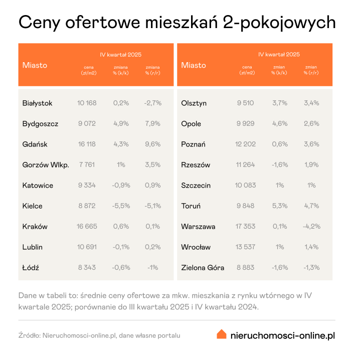 W pozostałych miastach było nieco drożej lub tak samo jak w III kwartale 2025 r. Wzrost średniej ceny ofertowej za dwa pokoje zaobserwowano w ośmiu stolicach regionalnych, chociaż skala zmian różniła się w zależności od regionu. We Wrocławiu, Szczecinie i Gorzowie Wlkp. było to tylko 1% k/k (średnio od 80 do 130 zł drożej na metrze), a w przypadku Gdańska, Bydgoszczy, Opola, Olsztyna i Torunia 3-5% k/k (od 330 do ponad 600 zł drożej na metrze). W pozostałych siedmiu miastach było stabilnie – kwartalne wahania cen wyniosły mniej niż 1%.