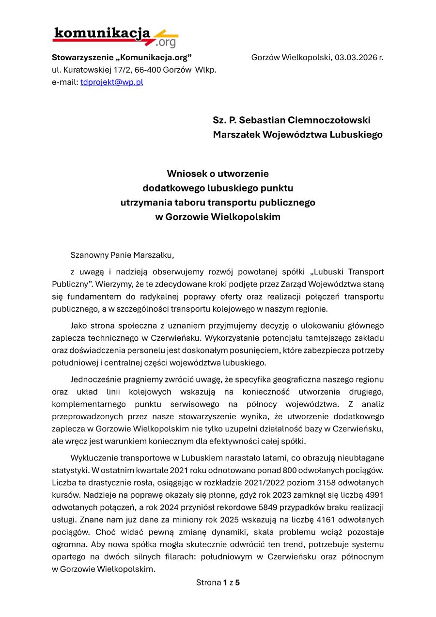 Otrzymaliśmy oficjalny wniosek, jaki stowarzyszenie „Komunikacja.org" skierowało do Marszałka Województwa Lubuskiego i dotyczy utworzenia dodatkowego lubuskiego punktu utrzymania taboru transportu publicznego w Gorzowie.