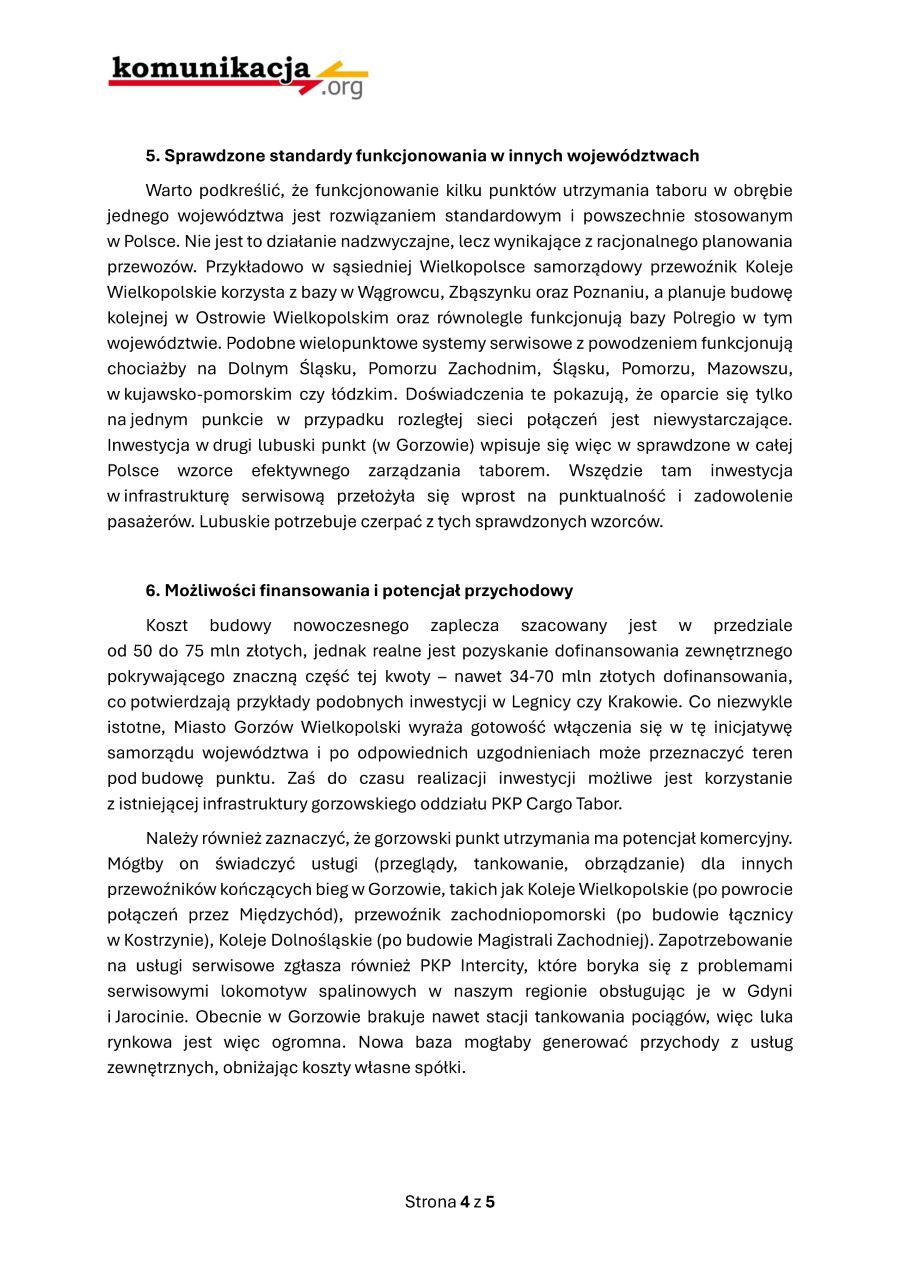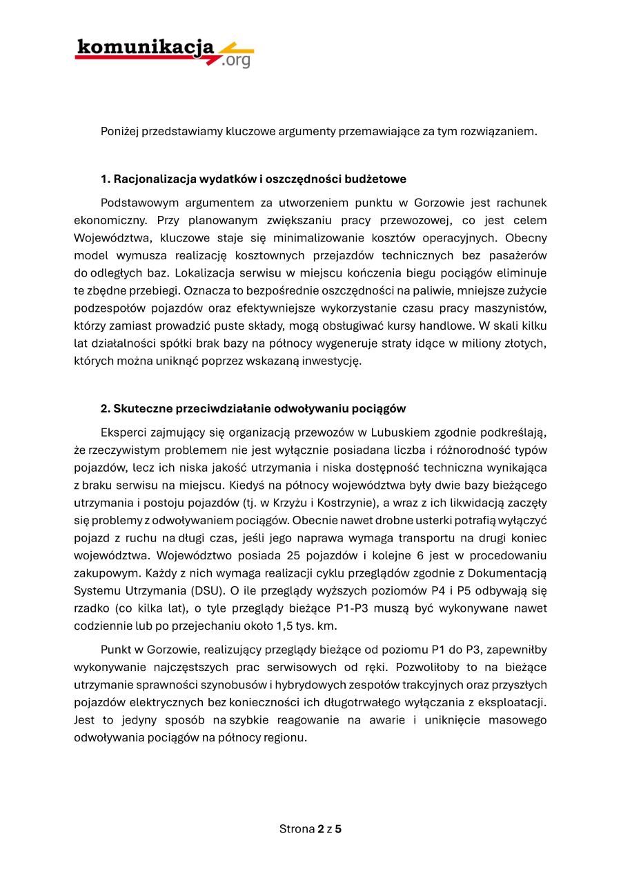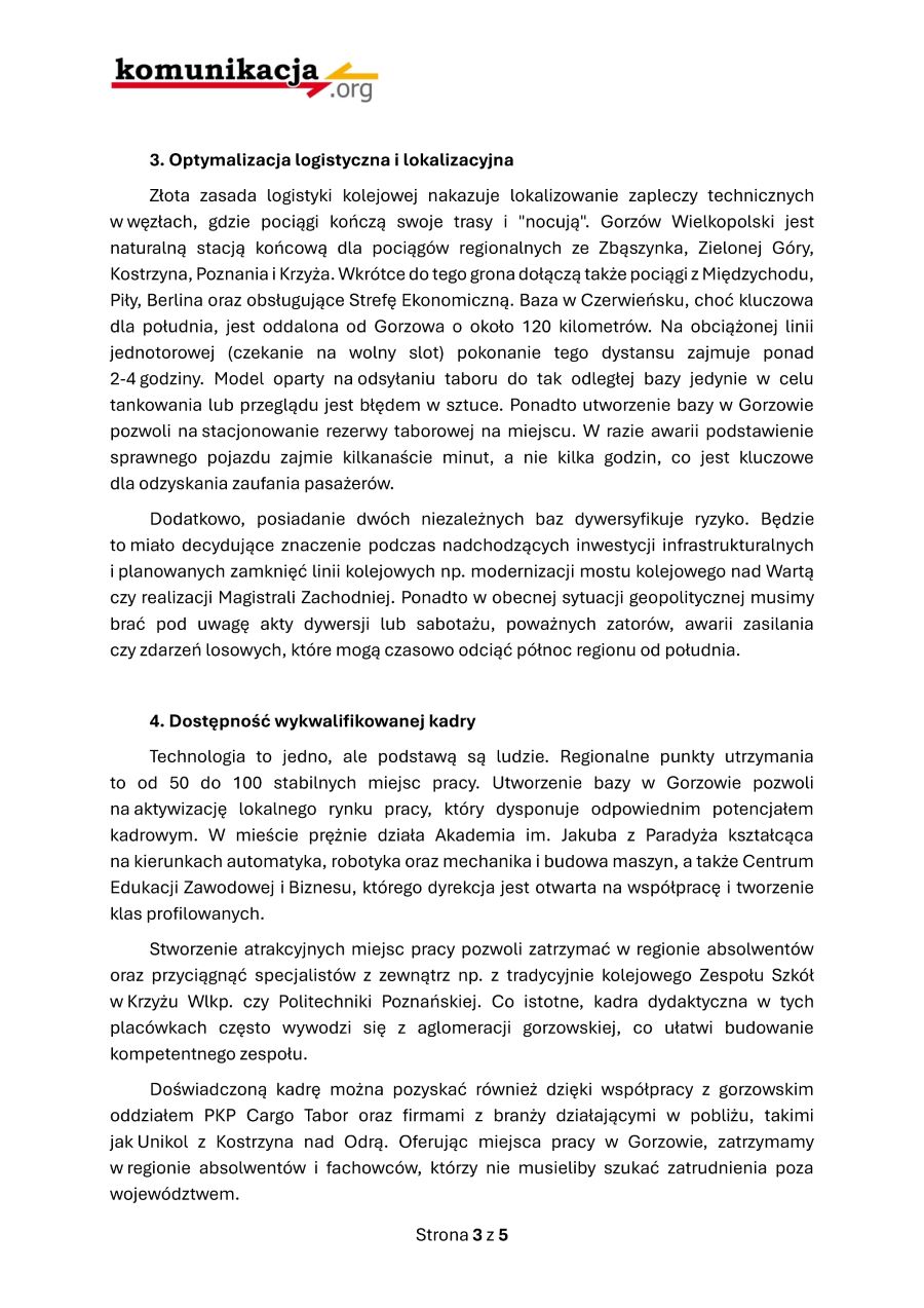 Jako strona społeczna z uwagą obserwujemy powołanie spółki „Lubuski Transport Publiczny" i z uznaniem przyjmujemy decyzję o ulokowaniu głównego zaplecza technicznego nowej spółki w Czerwieńsku. Aby jednak nowa spółka mogła skutecznie odwrócić trend masowego odwoływania pociągów, który w 2025 roku przyniósł 4161 przypadków braku realizacji usługi, niezbędna jest budowa drugiego komplementarnego punktu serwisowego na północy województwa. Od kiedy zlikwidowano bazę w Krzyżu i Kostrzynie, prawdziwym problemem na północy regionu jest właśnie niska dostępność techniczna pojazdów wynikająca z braku serwisu na miejscu.