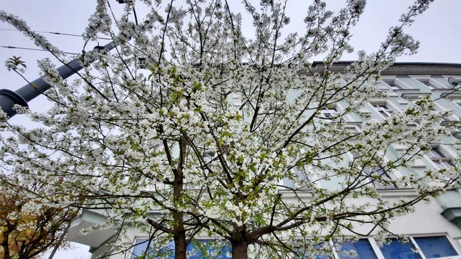 Ps. Zakwitła wisienka. Ma białe kwiaty, ale jest i tak piękna. Co prawda hanami trudno odprawić przy jedynym drzewku, ale spróbuję. Drzewko rośnie na rogu Chrobrego i 30 Stycznia, jakby kto pytał.