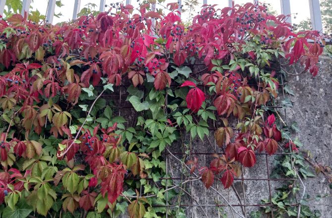 Przebarwia się wino. U mnie na podwórku wielki winobluszcz, który zmalał po remoncie podwórka, właśnie się odradza. Na płocie Filharmonii wino jest tak posadzone, że pięknie wygląda. Wino w bibliotece wojewódzkiej też zaczyna się czerwienić. No po prostu zaczyna być ślicznie. Jeszcze żeby zaczęło padać, jak jesienią powinno być, żeby było chłodniej, jak jesienią powinno być, to byłby komplet jesiennej pogody. Bo mgły jesienne i rosę już zaliczyliśmy w tym roku.