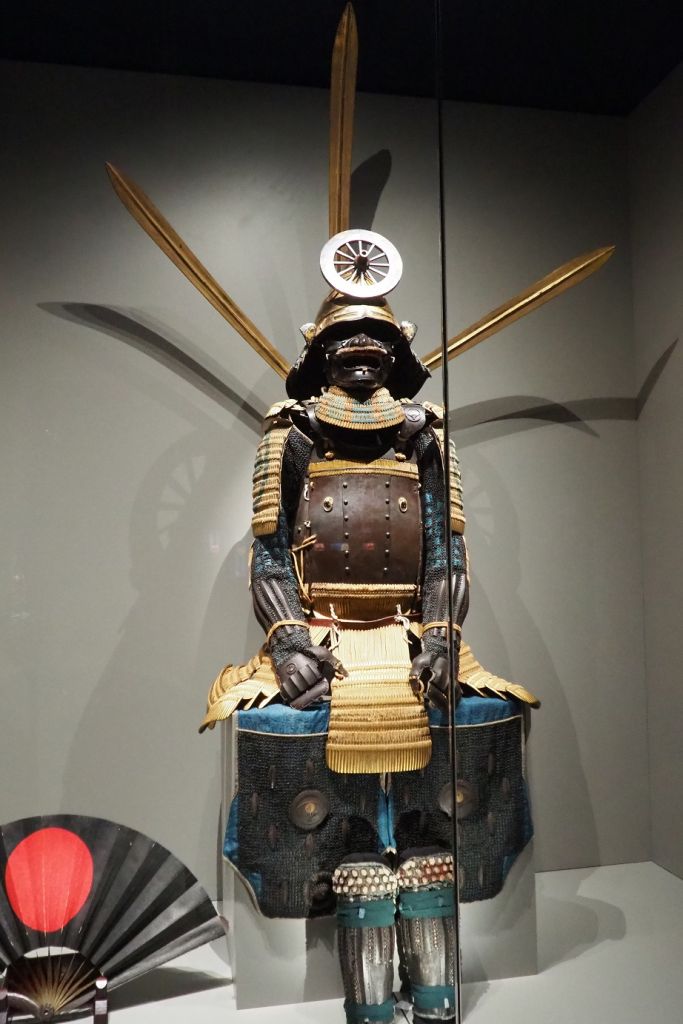 Już na samym wstępie zwiedzający natyka się na kompletne samurajskie zbroje i to z głębokiej przeszłości, bo są i XIV wieku, ale najwięcej jest z epoki Edo, czyli z XVII wieku. Każda umieszczona w świetnie oświetlonym szklanym kubiku przy którym znajduje się display z tekstem po niemiecku lub angielsku. Zbroje samurajskie to arcydzieła sztuki rąk ludzkich. Zaskakują pięknem wykonania, precyzja szczegółu, kolorem. Jest ich kilkadziesiąt. Jedną z nich, z czarnej laki, umocowano na obrotowym talerzu, tak że można dokładnie ją poobserwować.