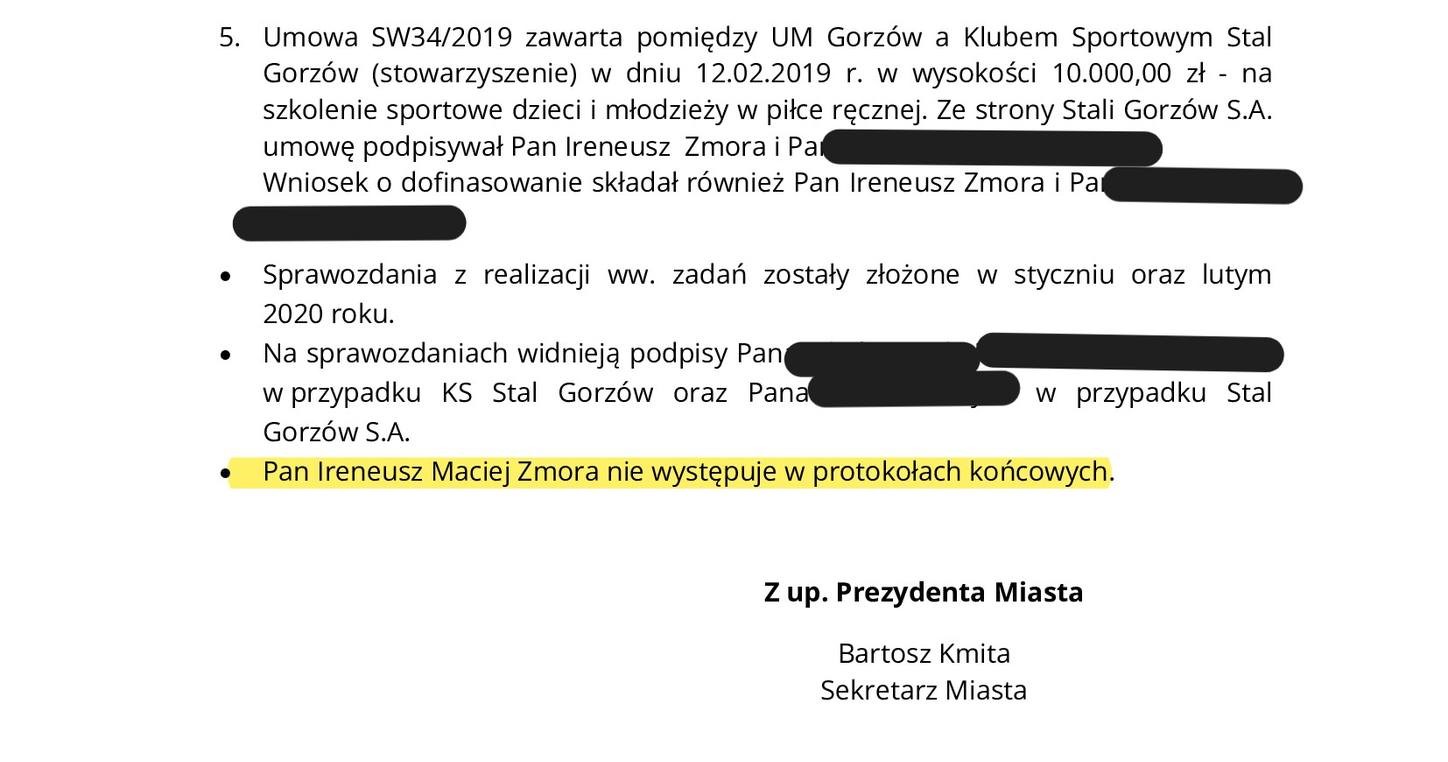 W odpowiedzi Gorzów Wielkopolski podpisanej przez sekretarza miasta Bartosza Kmitę jest napisane: - „Pan Ireneusz Maciej Zmora nie występuje w protokołach końcowych’’. Zapraszam do zapoznania się z załącznikami – kończy.