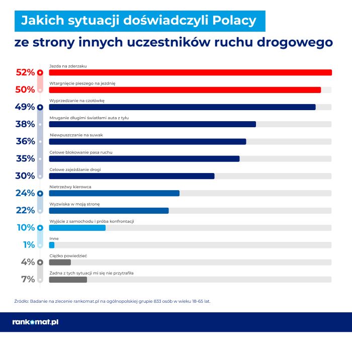 Jednocześnie z badania Rankomat.pl wynika, że co drugi z nich doświadczył jazdy na zderzaku oraz wtargnięcia pieszego na jezdnię.