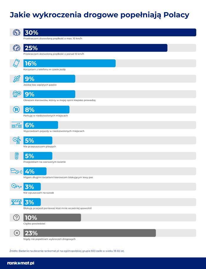 Choć nie jest to wykroczenie drogowe, aż 9% kierowców przyznaje, że zdarza im się obrażać innych uczestników ruchu, za ich zdaniem, kiepskie umiejętności prowadzenia pojazdu. Jedynie 23% badanych twierdzi, że nie łamie żadnych przepisów ruchu drogowego. Pytanie tylko, czy rzeczywiście jest tak w praktyce.
