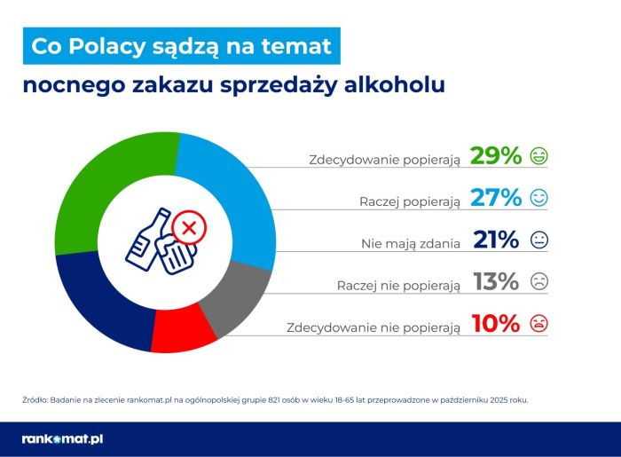 Badanie Rankomat.pl pokazuje, że 29% ankietowanych zdecydowanie popiera nocny zakaz sprzedaży alkoholu, a 27% raczej go popiera. W sumie daje to 56% zwolenników. 21% nie ma zdania, 13% jest raczej przeciwna, a tylko 10% zdecydowanie nie zgadza się z takim rozwiązaniem.