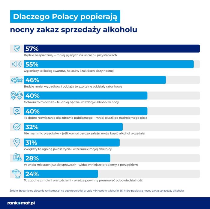 Z badania Rankomat.pl wynika też, że 62% przeciwników uważa, iż zakaz niczego nie zmieni. Tymczasem doświadczenia z polskich miast pokazują coś innego – ograniczenie sprzedaży alkoholu w godzinach 22:00–6:00 przynosi wymierne korzyści społeczne.