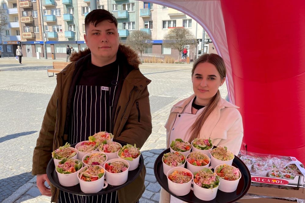 Punktualnie w południe na Starym Rynku było smacznie, zdrowo i kolorowo. Pod samą Katedrą postawiony został namiot, gdzie mieszkańcy mogli odebrać porcję smacznej sałatki przygotowanej przez zespół gorzowskiego „gastronomika” i odebrać ufundowane przez GRH bratki. Kwiaty były w kolorach żółtym i niebieskim, na znak solidarności z obywatelami Ukrainy.
