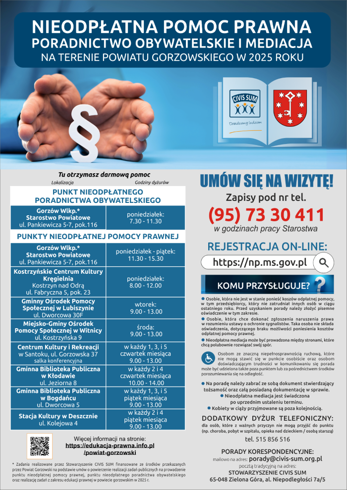 Na porady obowiązują zapisy: pod nr tel. (95) 73 30 411 w godzinach pracy Starostwa w Gorzowie.