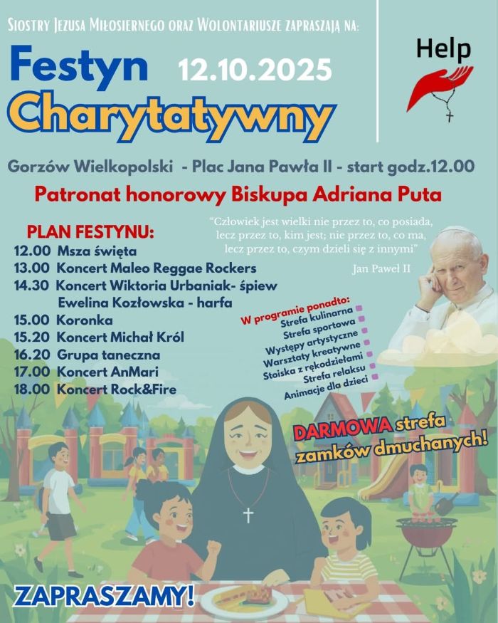 Siostry Jezusa Miłosiernego oraz wolontariusze zapraszają 12 października na Festyn Charytatywny, który odbędzie się na gorzowskim Palcu Jana Pawła II. Początek o godzinie 12.00, a pierwszym punktem jest msza święta, po której wszystkich czeka wiele atrakcji.