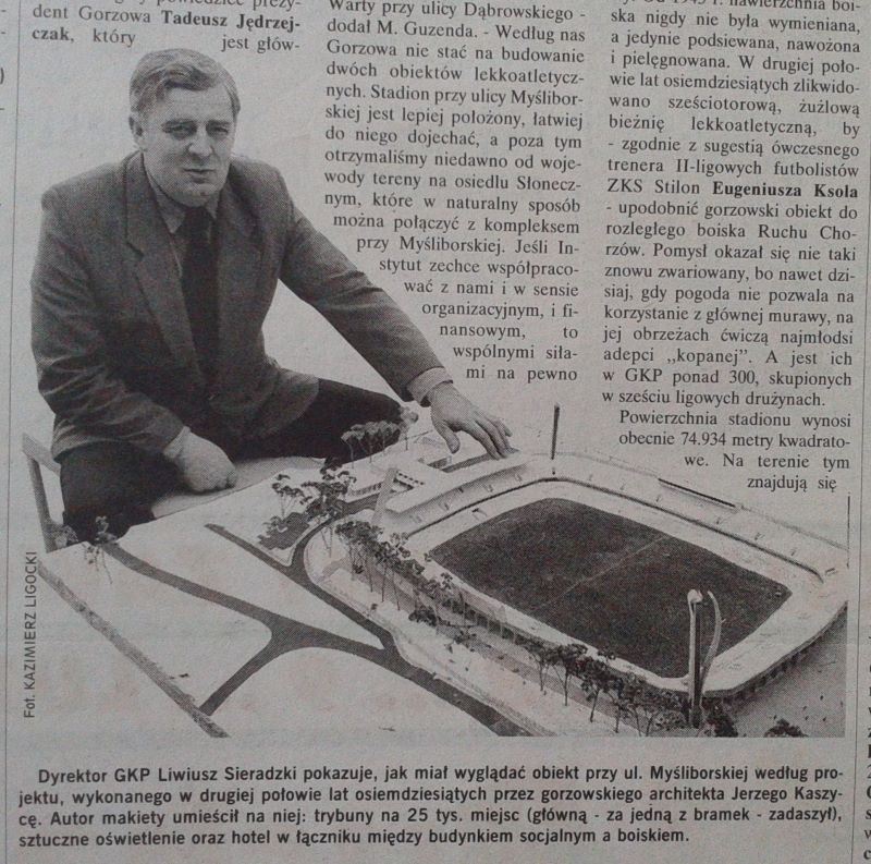 Już w drugiej połowie lat 80. znany gorzowski architekt Jerzy Kaszyca przygotował bardzo ciekawy projekt z trybunami na 25 tysięcy miejsc. Wykonano piękną makietę, którą przez wiele lat można było podziwiać na korytarzu w siedzibie ZKS Stilon przy ul. Energetyków. Gdzie teraz ona się znajduje, nie wiemy.