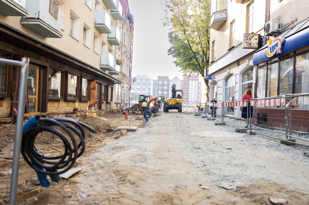 Prace prowadzone na deptaku polegają na profilowaniu koryta drogi, zagęszczeniu podłoża oraz układaniu obrzeży. Równolegle, na ul. Wełniany Rynek, wykonywane są przyłącza kanalizacji deszczowej.