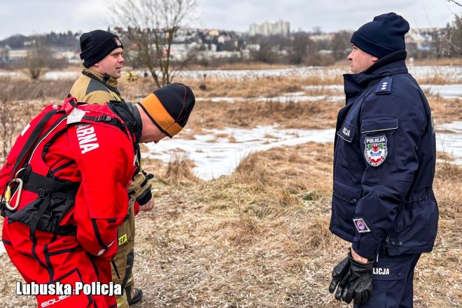 W działania zaangażowani są policjanci, a także strażacy. Po zamarzniętej rzece poruszają się sprzęty specjalistyczne, a z góry teren jest obserwowany z pomocą dronów.