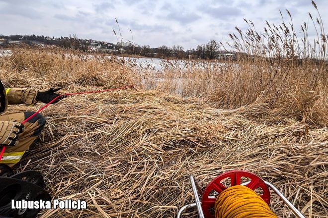 Po zamarzniętej rzece strażacy poruszają się na saniach lodowych. Pomagają także drony powietrzne oraz podwodne, które przekazują obraz operatorom.
