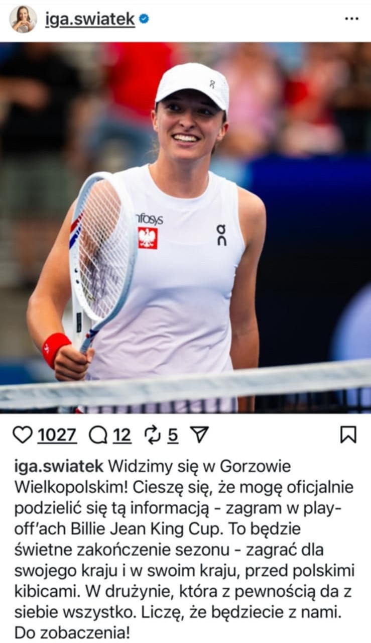 - Widzimy się w Gorzowie Wielkopolskim! Cieszę się, że mogę oficjalnie podzielić się tą informacją – zagram w play-off’ach Billie Jean King Cup. To będzie świetne zakończenie sezonu – zagrać dla swojego kraju i w swoim kraju, przed polskimi kibicami. W drużynie, która z pewnością da z siebie wszystko. Liczę, że będziecie z nami. Do zobaczenia!” – tak napisała sześciokrotna triumfatorka turniejów wielkoszlemowych na Instagramie.